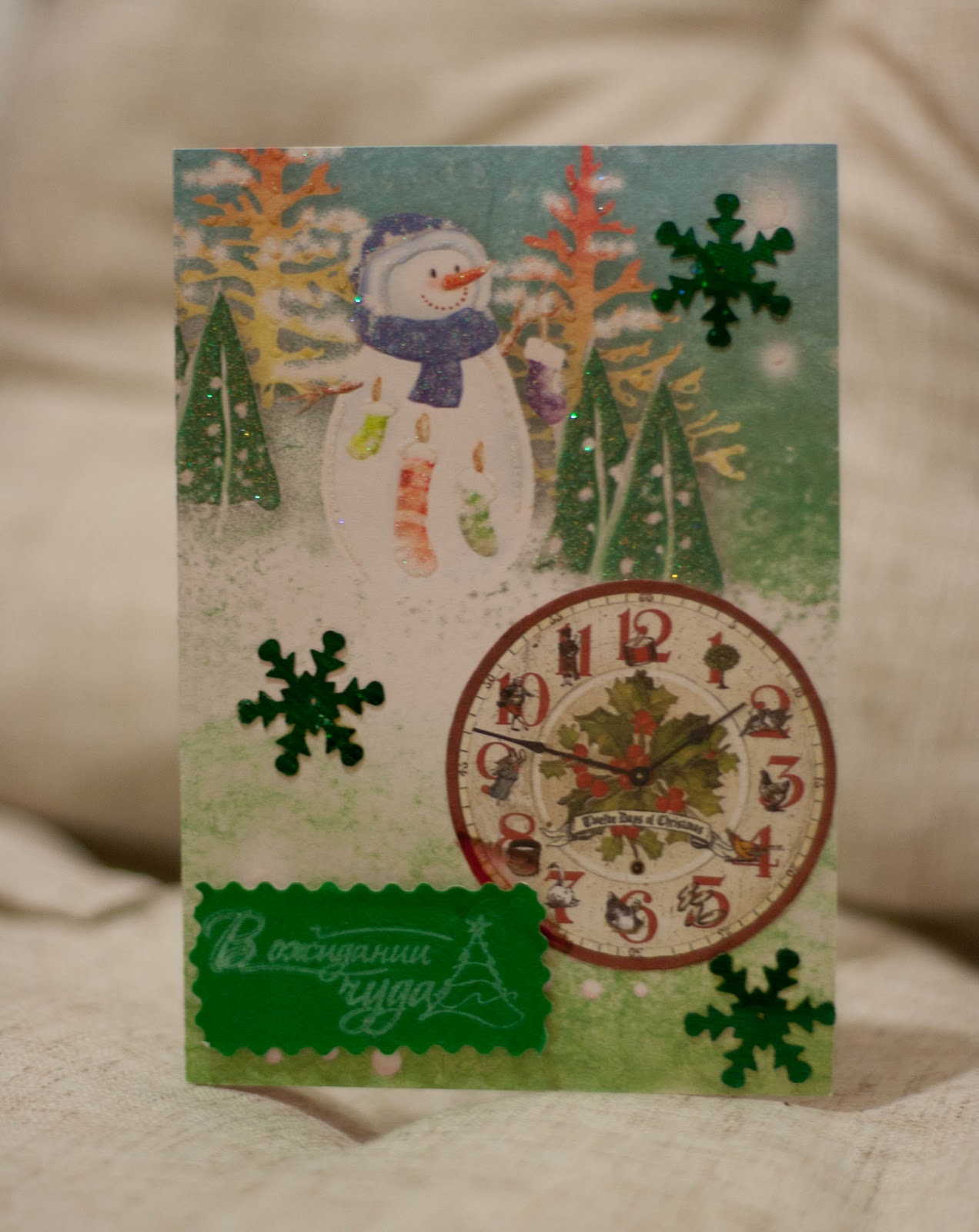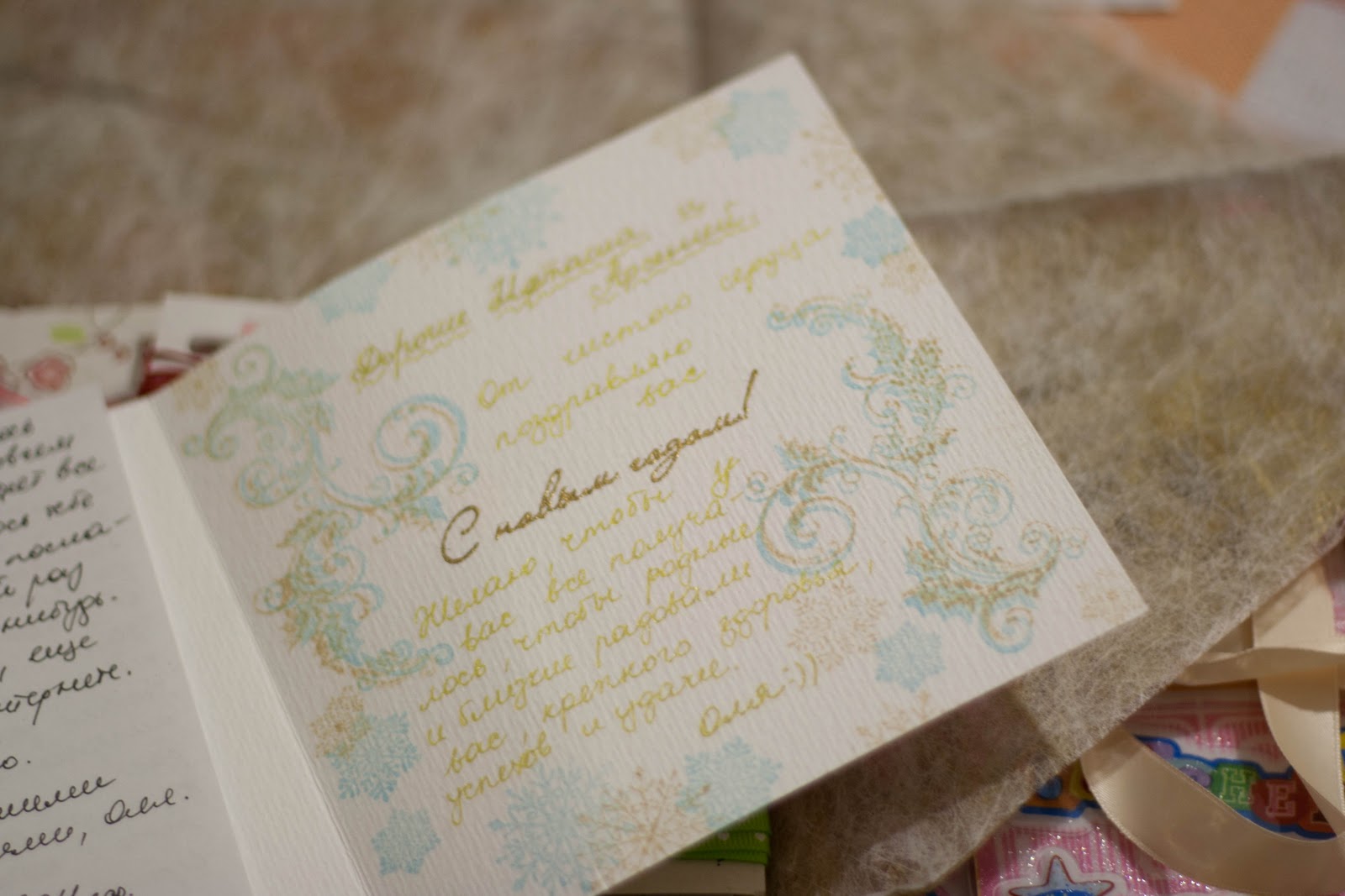 Честно говоря, корпела в этот раз над открыточкой долго))) Особенно много времени заняло украшательство уголков) Долго не могла найти чем их украсить, потом вырезала, потом наносила глиттер, потом подводила по краям лайнером... Потом был жидкий жемчуг... С нижним углом еще больше провозилась... Действия были примерно те же. Но когда все было уже готово, поняла, что листочки очень уж ярко смотрятся и решила замазать их белым акрилом.. А потом еще и золотистым сверху прошлась, так как полученный результат показался мне скучноватым... В общем самым нижним углом осталась не очень довольна, но в целом открытка мне симпатична)) Вы что о ней думаете? Пишите! Мне очень интересно ваше мнение!